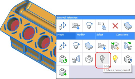 3、切换回模型空间,鼠标悬浮到 cylinder block,然后单击隐藏工具 (BMHIDE)