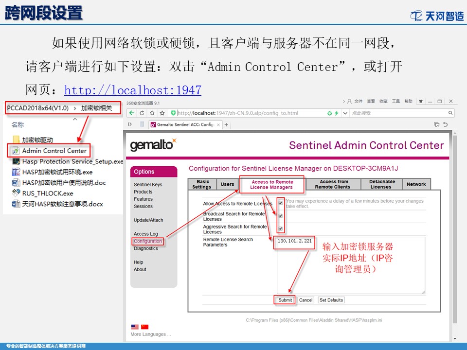 如果使用网络软锁或硬锁,且客户端与服务器不在同一网段,请客户端进行如下设置:双击安装包“加密锁相关”文件夹下的“Admin Control Center”,或打开网页:http://localhost:1947
