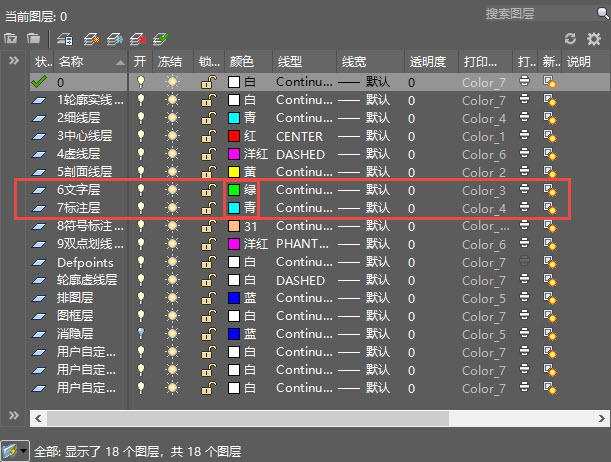 天河CAD的序号由图层:“6文字层”和“7标注层”组成,如果修改序号颜色,可以修改这两个图层颜色后,执行“视图->全部重生成”命令即可。